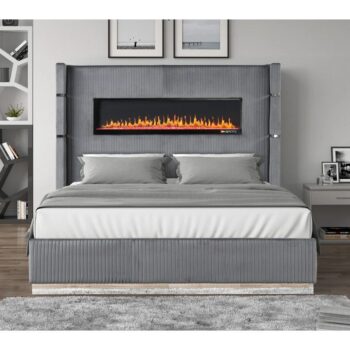 Luxury Velvet King Bed with Ambient Light & Fireplace Display