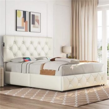Modern Queen-Sized Upholstered PU Platform Bed with Wireless Charging and Storage