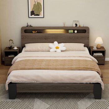 Queen Size LED Upholstered Platform Bed Frame with USB Charging